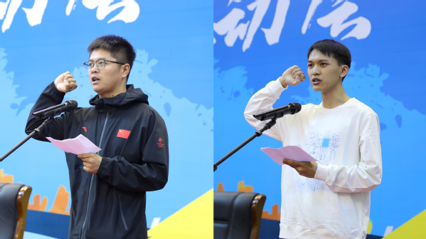 裁判员代表、生命健康学院张涛老师,运动员代表、电子信息学院韦凡同学分别郑重宣誓。