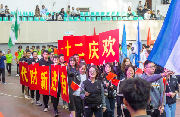 在热烈的运动员进行曲中,入场式正式开始。全体裁判员以及各学院的方队先后入场,拉开了本届运动会的序幕。运动员们英姿飒爽,喊着嘹亮的口号,体育馆内到处洋溢着热情的欢笑和青春的活力。
